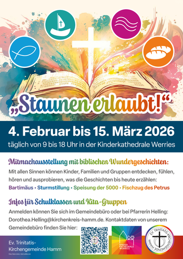 Aufgrund der Gemeindebürosituation melden sich Schulklassen und Kitagruppen bitte direkt bei Pfarrerin Dorothea Helling (dorothea.helling@kirchenkreis-hamm.de) oder bei Pfarrerin Roxanne Camen-Vogel (roxanne.camen-vogel@kirchenkreis-hamm.de).