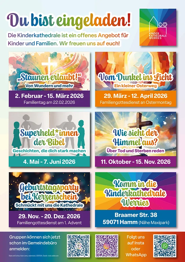 2025 versuchen wir uns an etwas ganz Neuem. Wir wollen die Erlöserkirche in Werries in eine Kinderkathedrale verwandeln. Eine Kirche extra für Kinder. In der Kirche sollen Kinder biblische Geschichten und christliche Glaubensinhalte kindgerecht erleben. Die Kinderkathedrale richtet sich an die Kinder vom Kindergartenalter bis zum Ende der Grundschulzeit, aber auch einfach an alle, die im Herzen noch Kind geblieben sind.